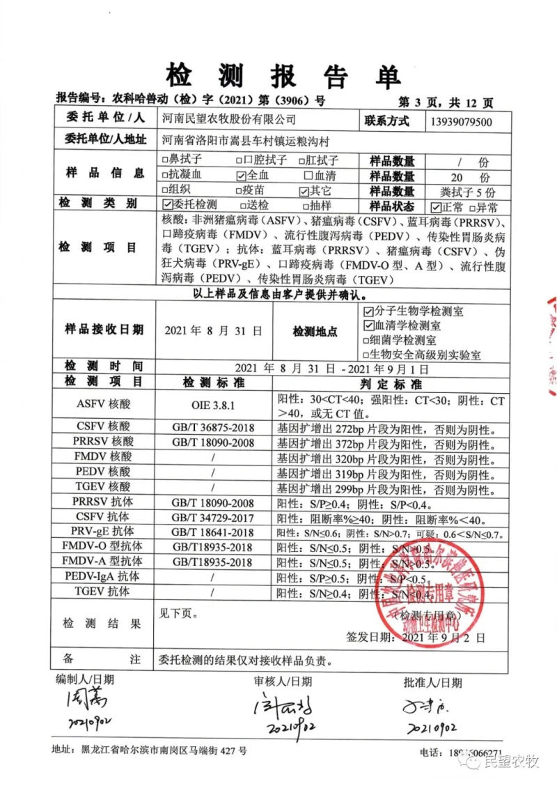 2021-09-02 民望农牧 哈兽研检民望农牧分别在郑州、嵩县设有高级别自检实验室,生产一直接受当地主管部门的监督检测,此次又与哈尔滨兽医研究所开展紧密合作,持续打造高健康民望5A原种。